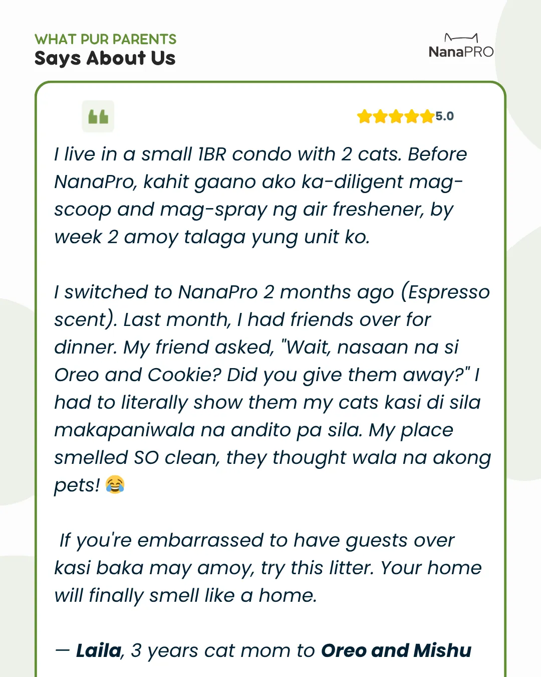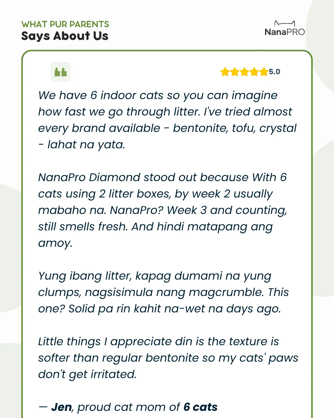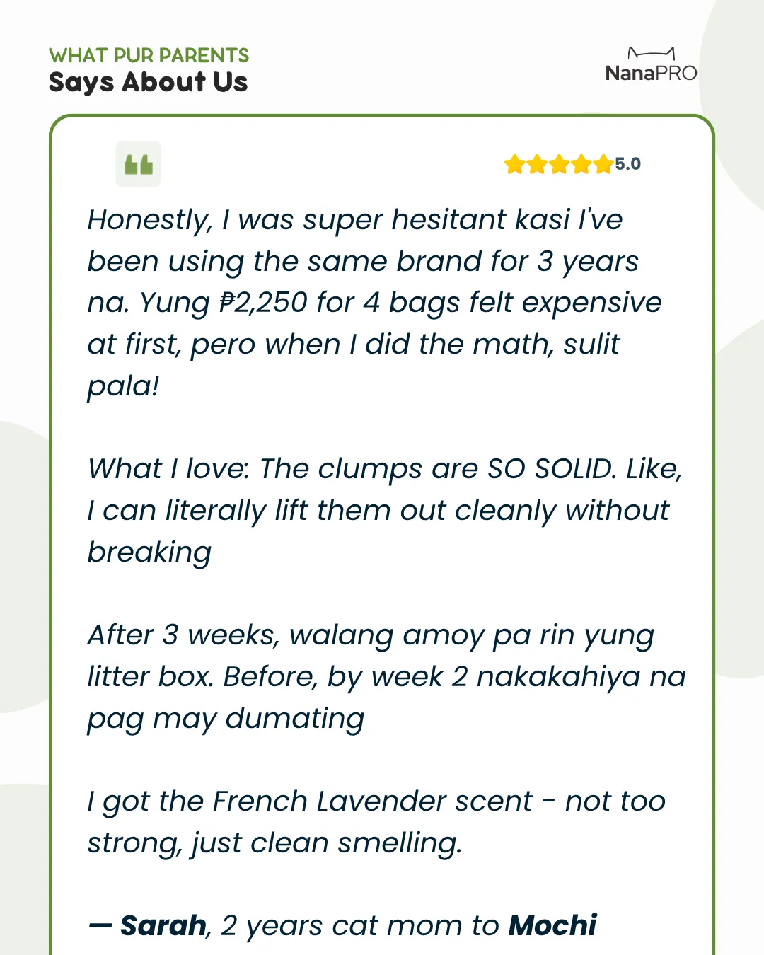 "I was spending ₱800 on 'premium' imported litter every 2 weeks. NanaPro costs less and works better. The clumps are insane—they literally lift out in one piece."