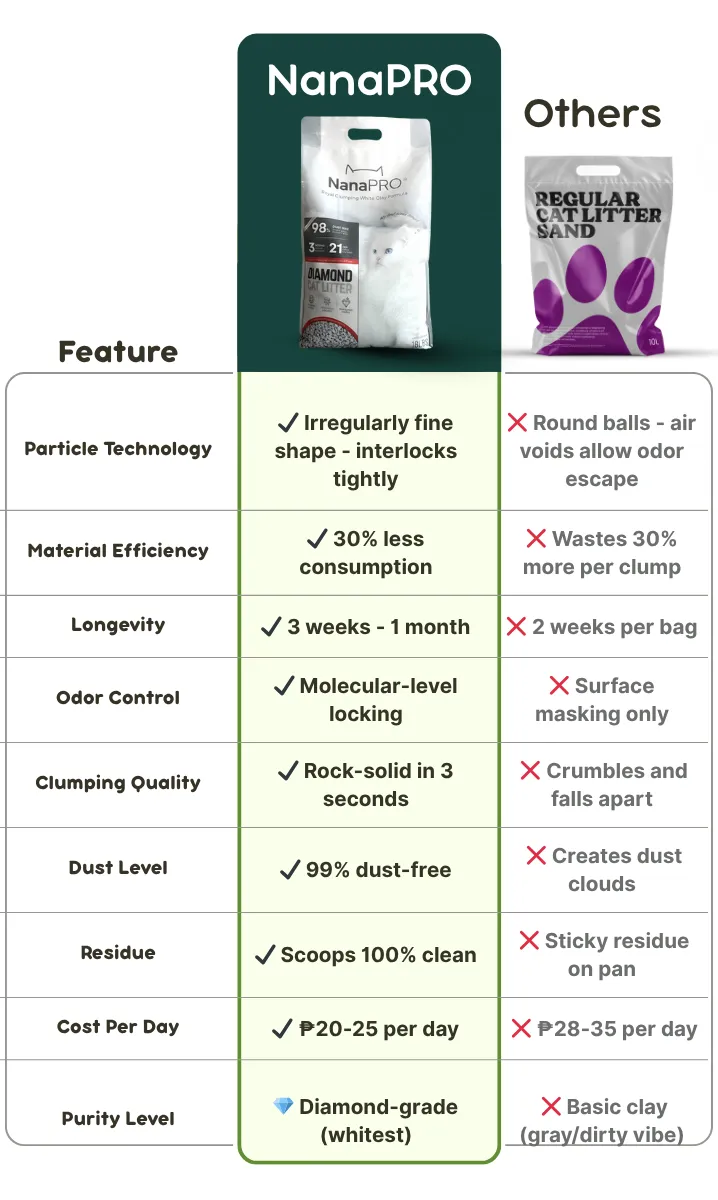 ₱800-₱1,000 monthly on litter that barely lasts. And you keep switching brands thinking 'maybe this one will be different' (Spoiler: They're all the same round-shaped bentonite).